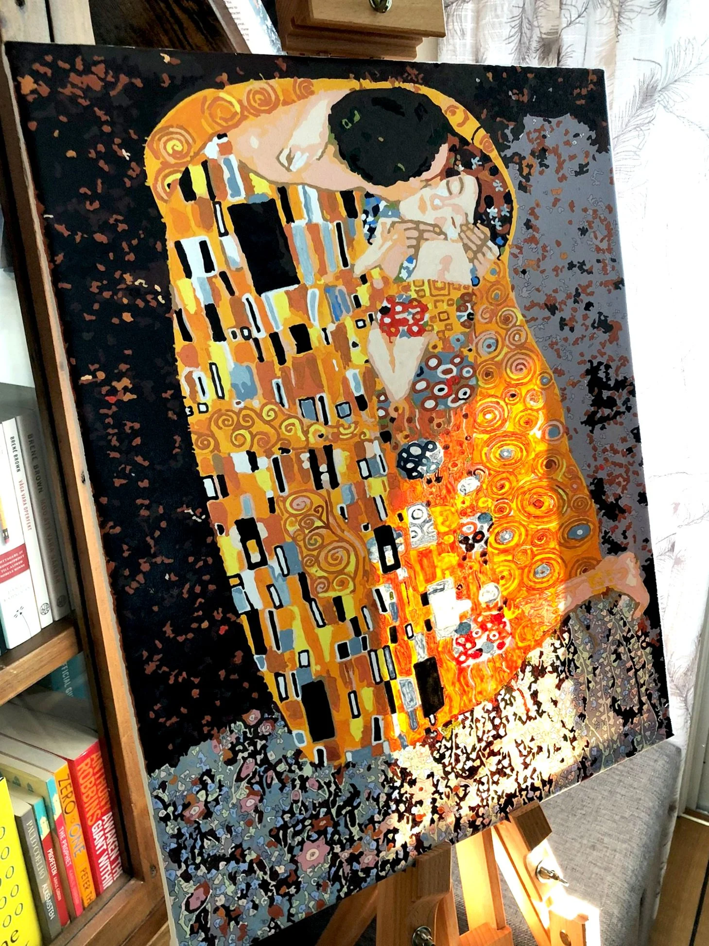 I started my first paint-by-numbers acrylic painting project about 3 weeks ago. For this, I’ve picked THE KISS by the Austrian Symbolist painter Gustav Klimt (1908). I LOVE this painting! I’ve given away my large IKEA 120x120cm artwork in Singapore when I moved to Sweden, so I’m now re-creating it with my own hands (and heart).